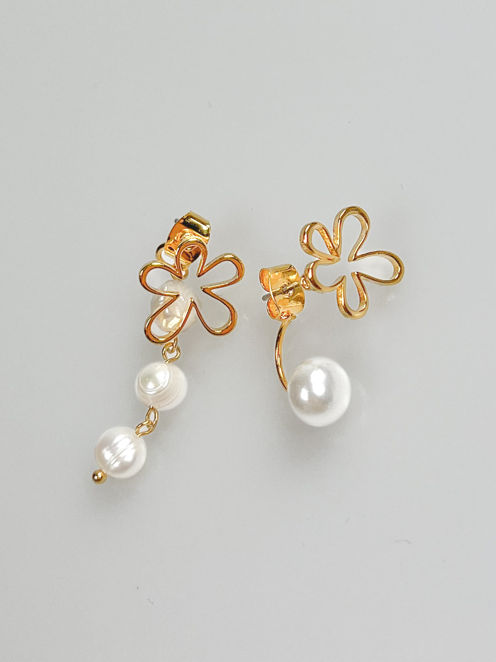 Ett par asymmetriska örhängen i färgen guld. De är formade som blommor och har hängande pärlor.