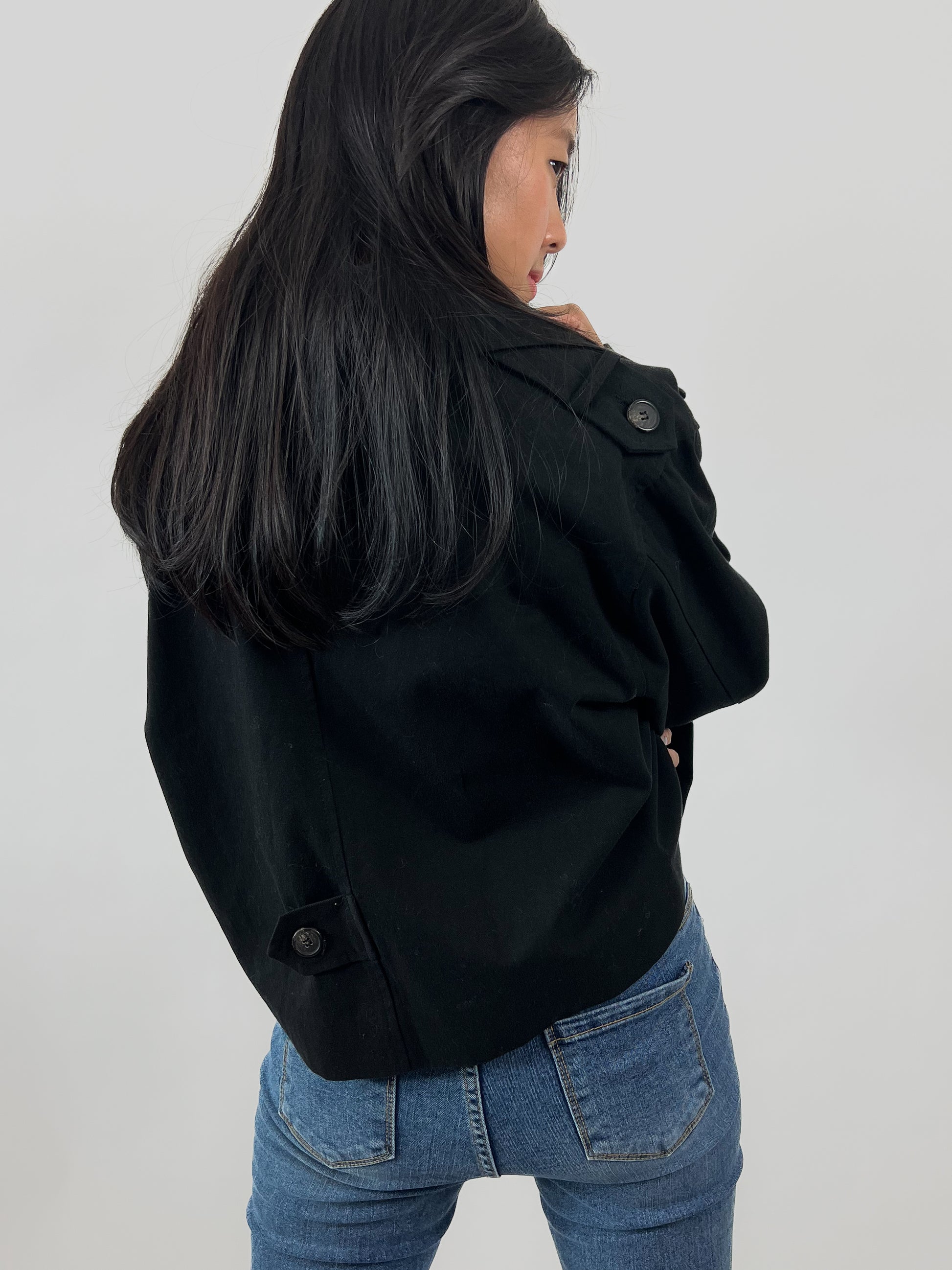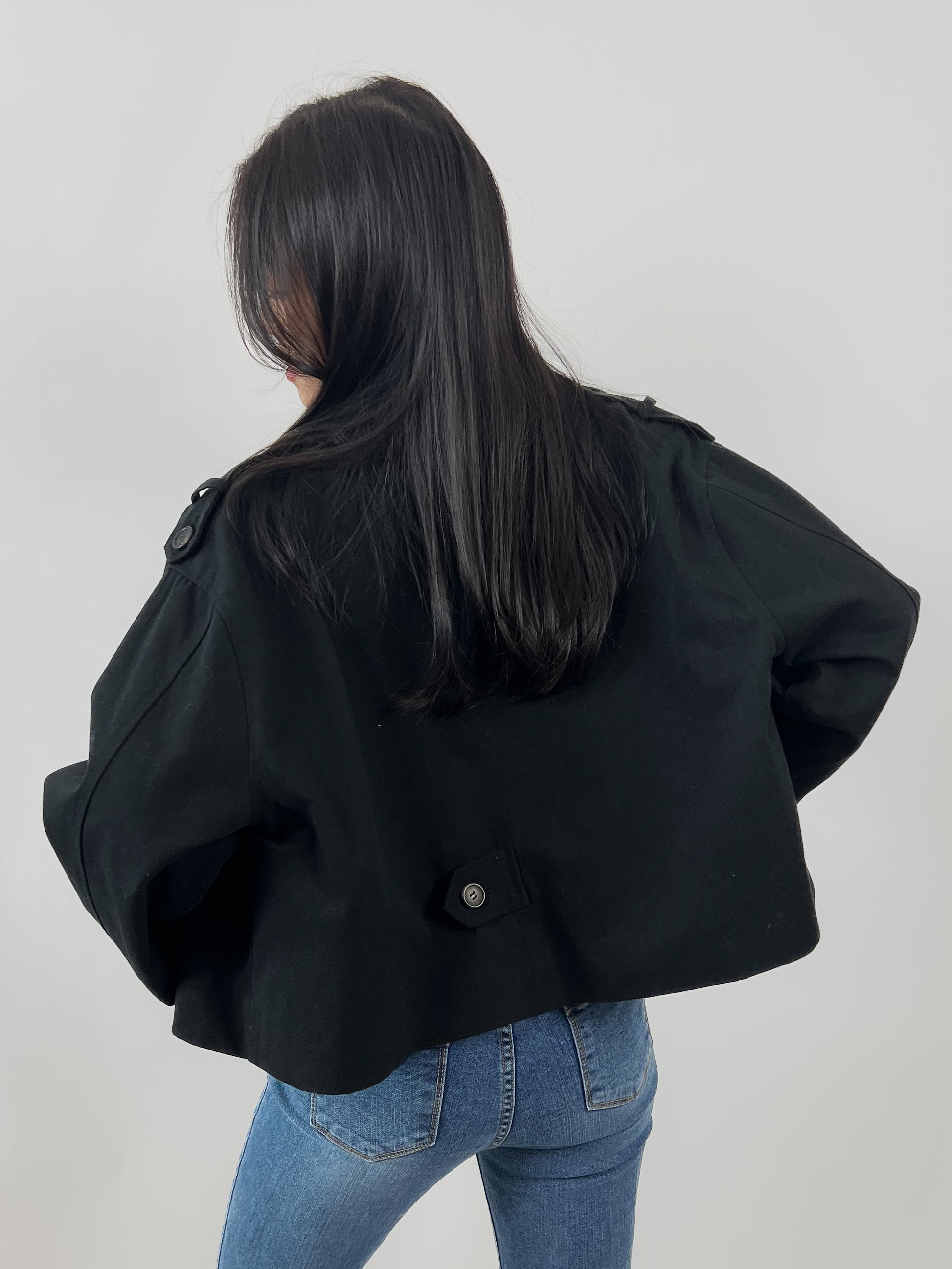 En snygg och kort trenchcoat som är lite oversized i passformen. Kappan är dubbelknäppt och har rymliga fickor.