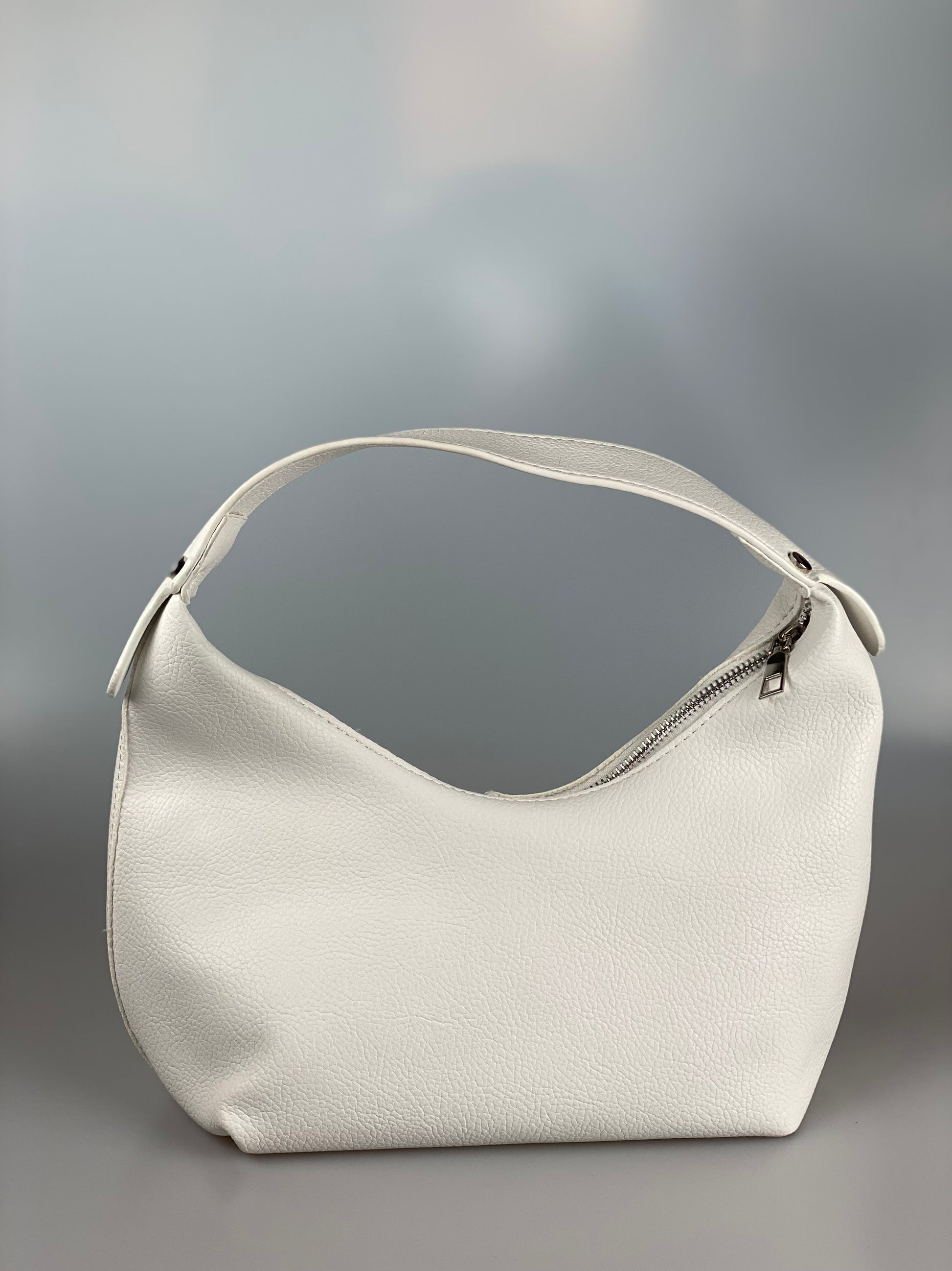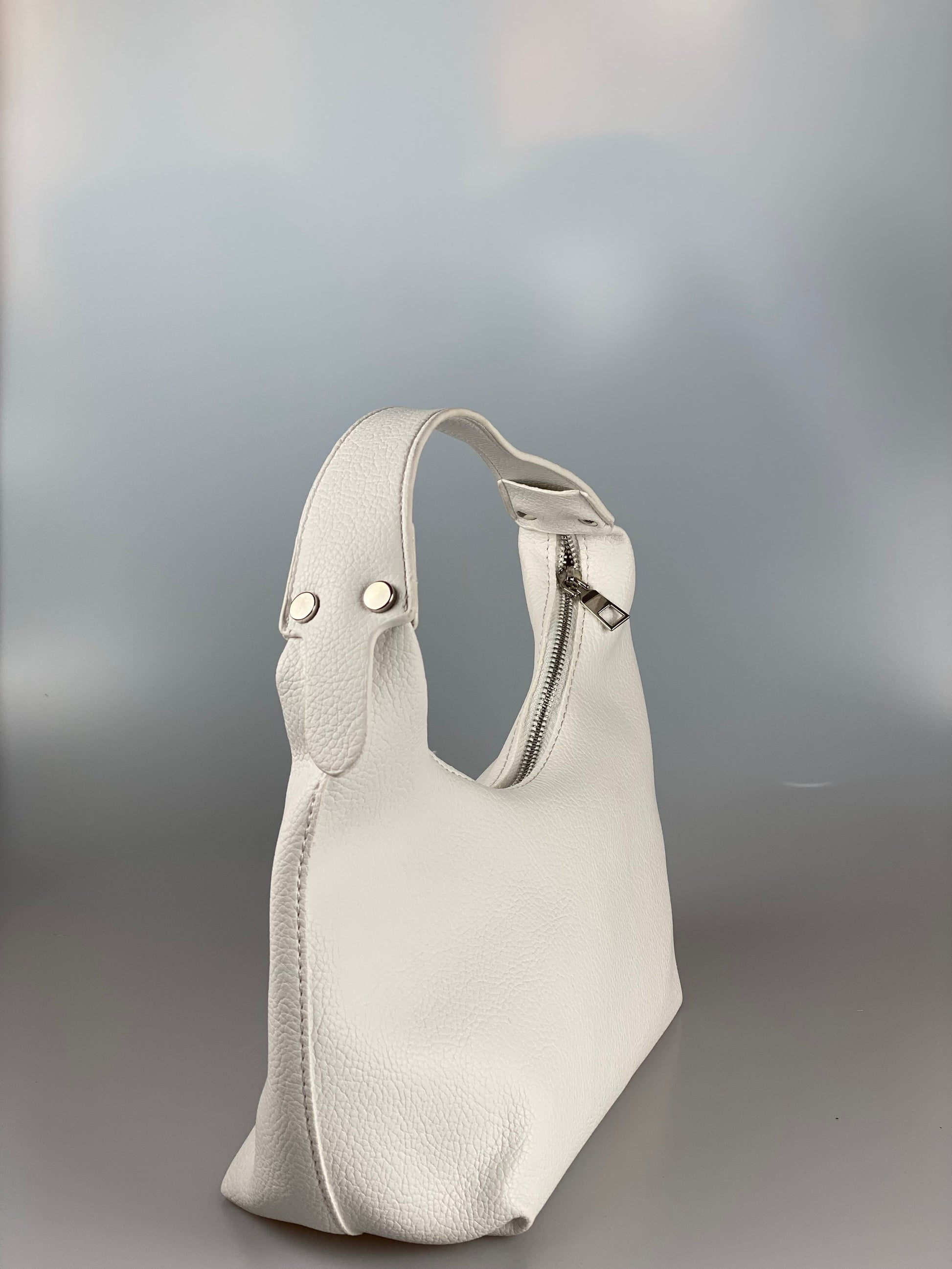 En liten vit handväska i läderimitation. Väskan har handtag och dragkedja.