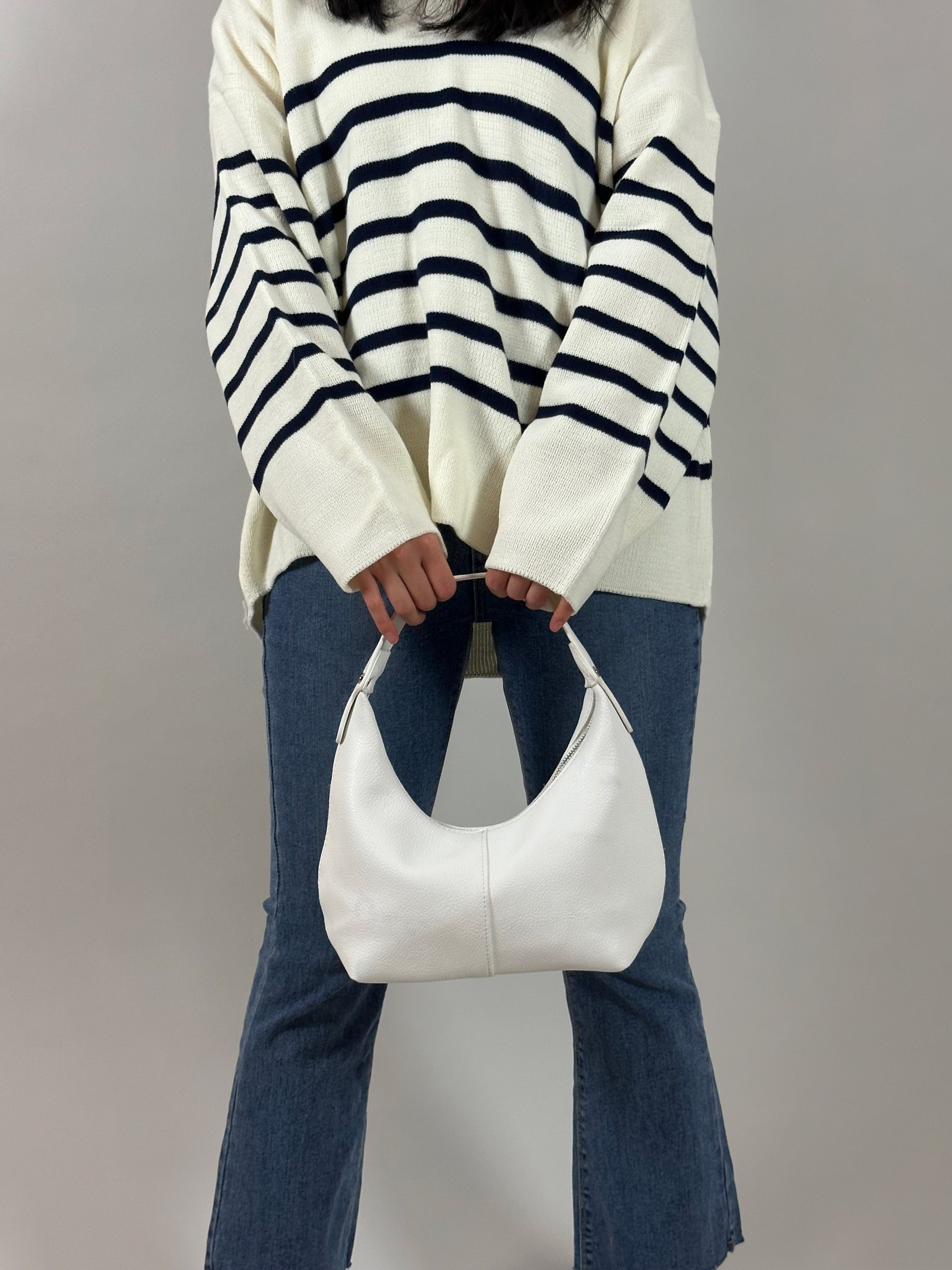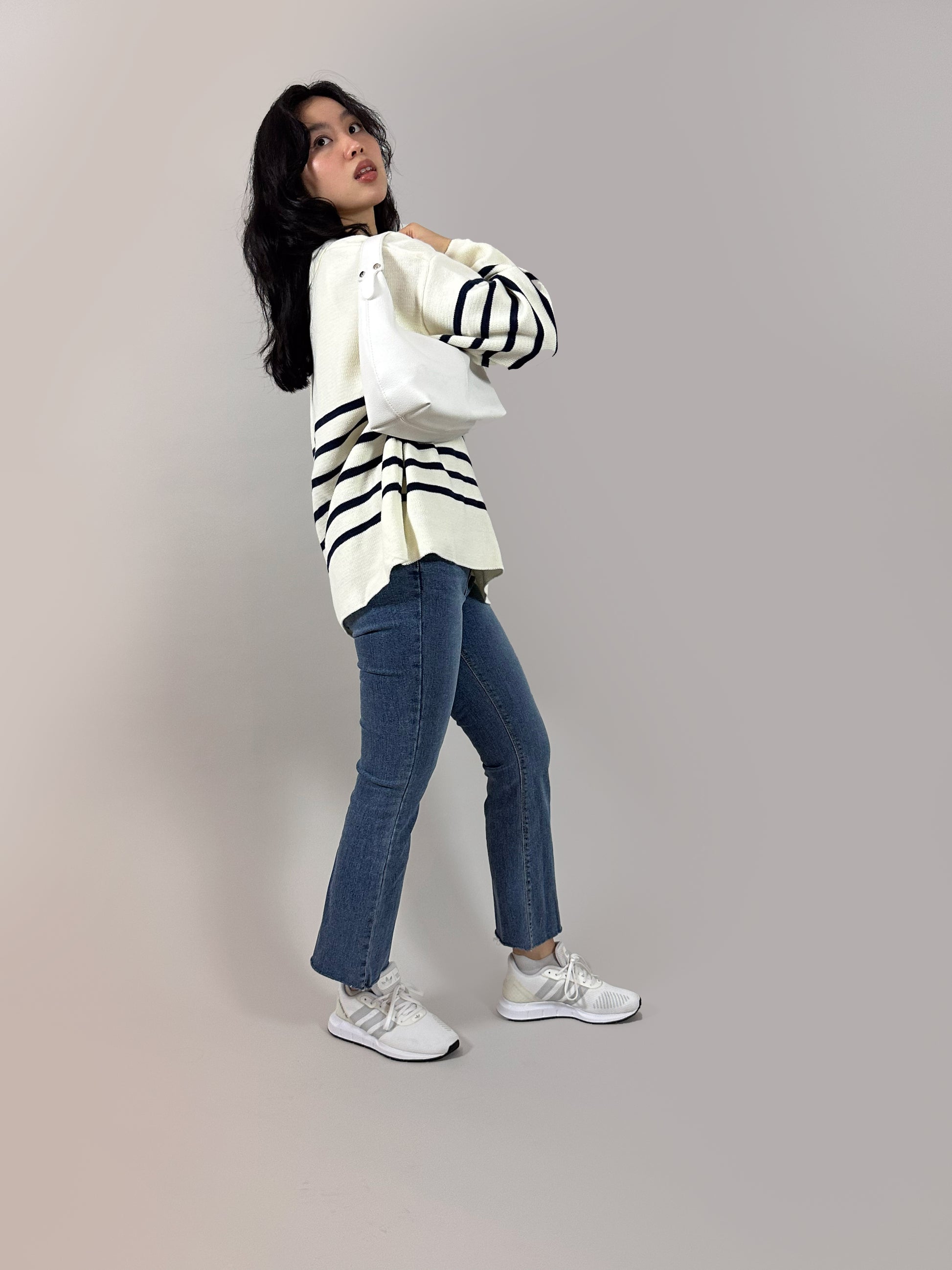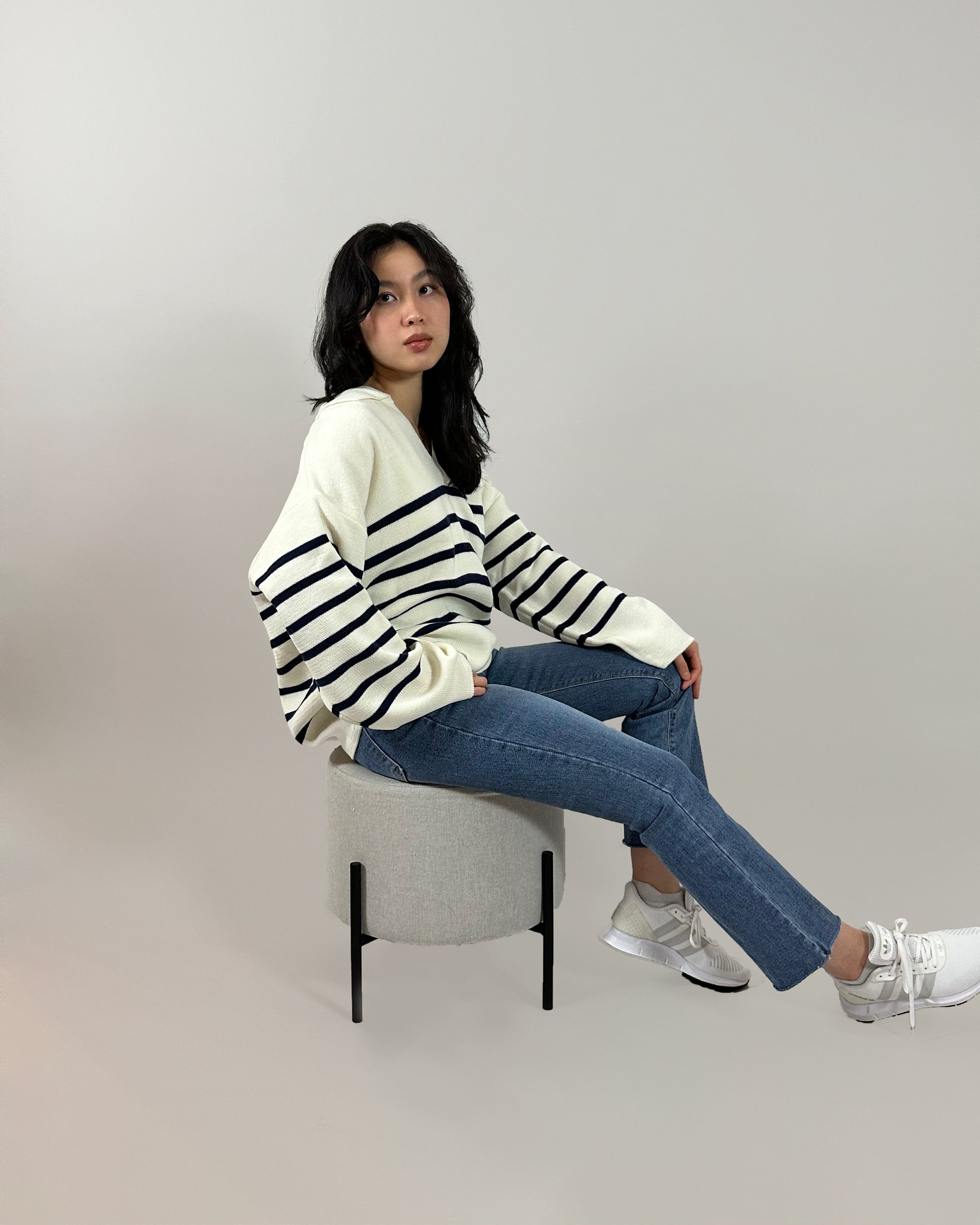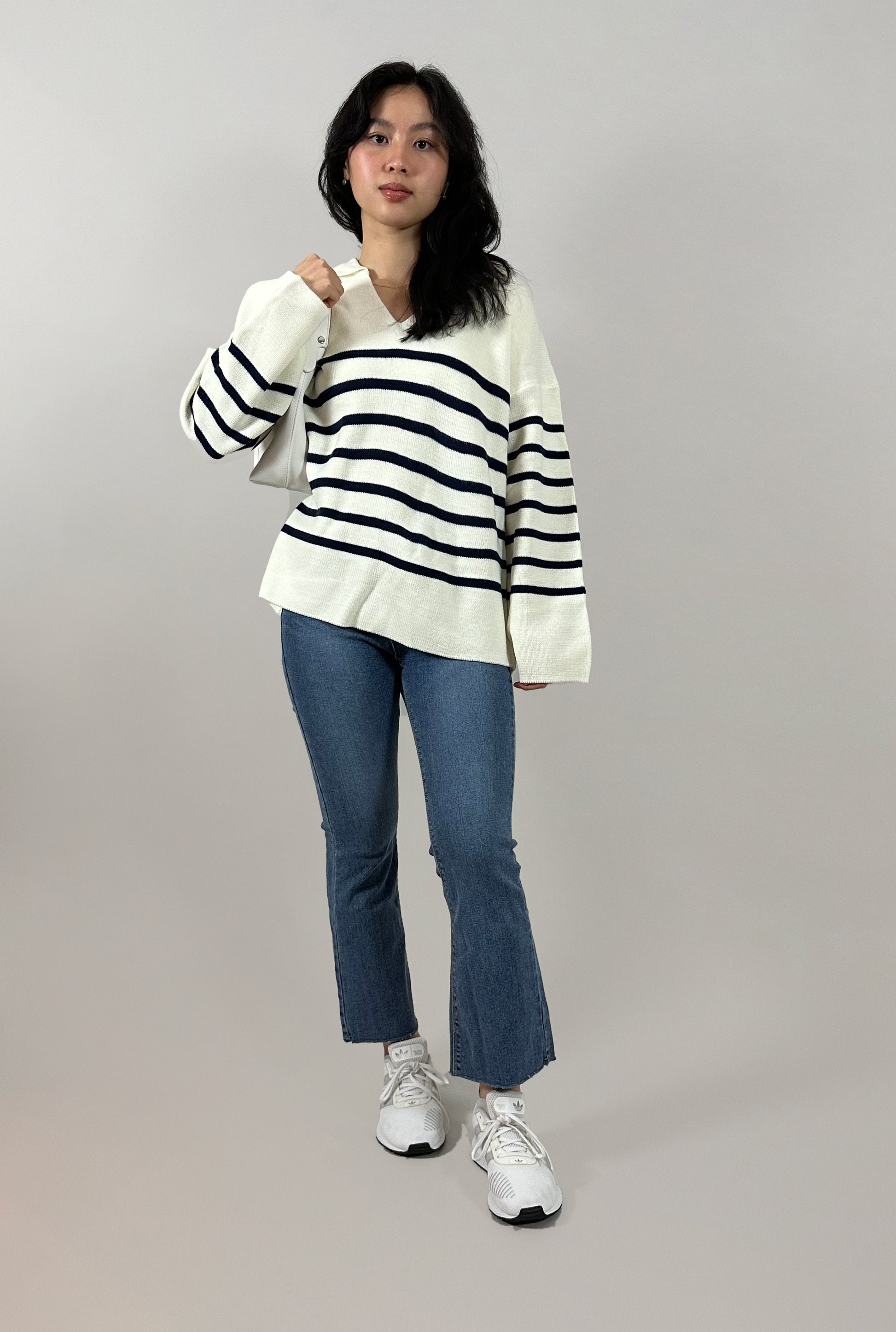 En randig stickad tröja med v-neck. Tröjan har krage och långa ärmar.
