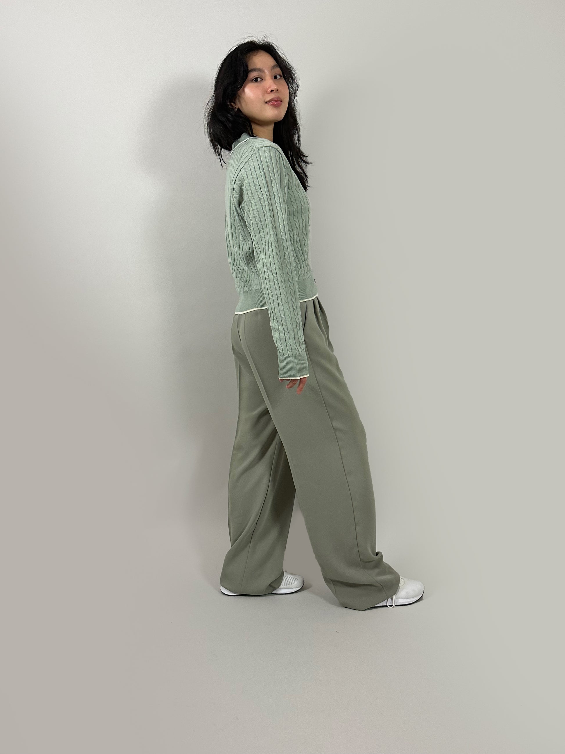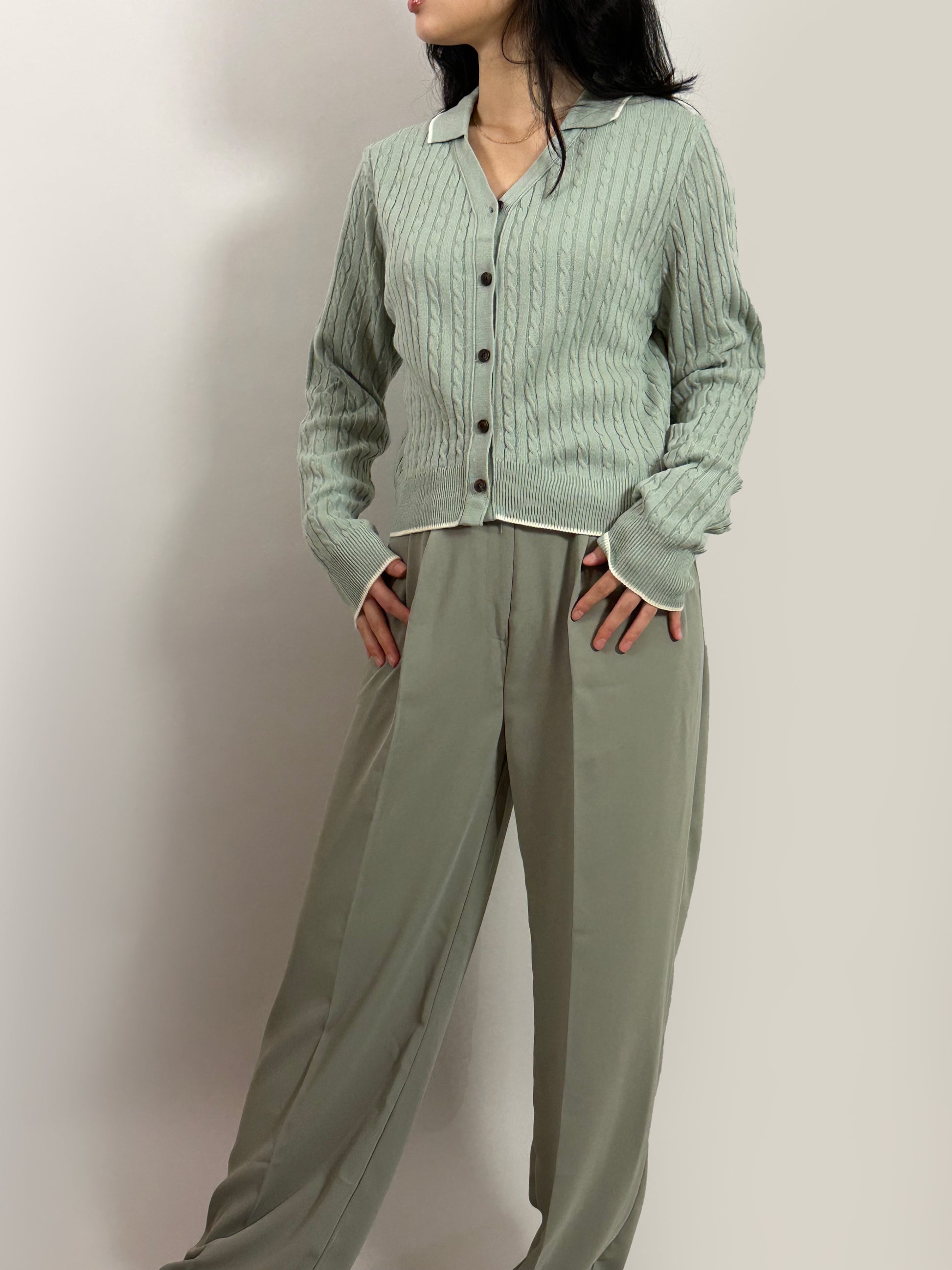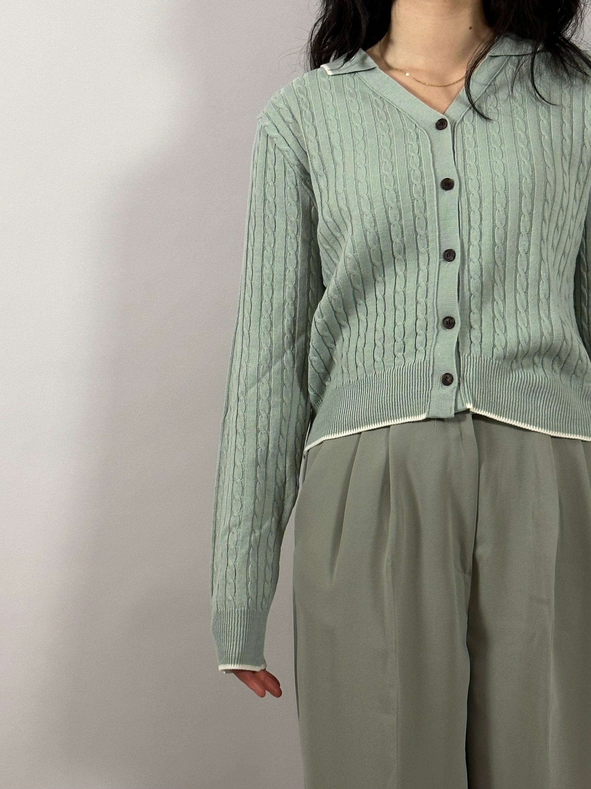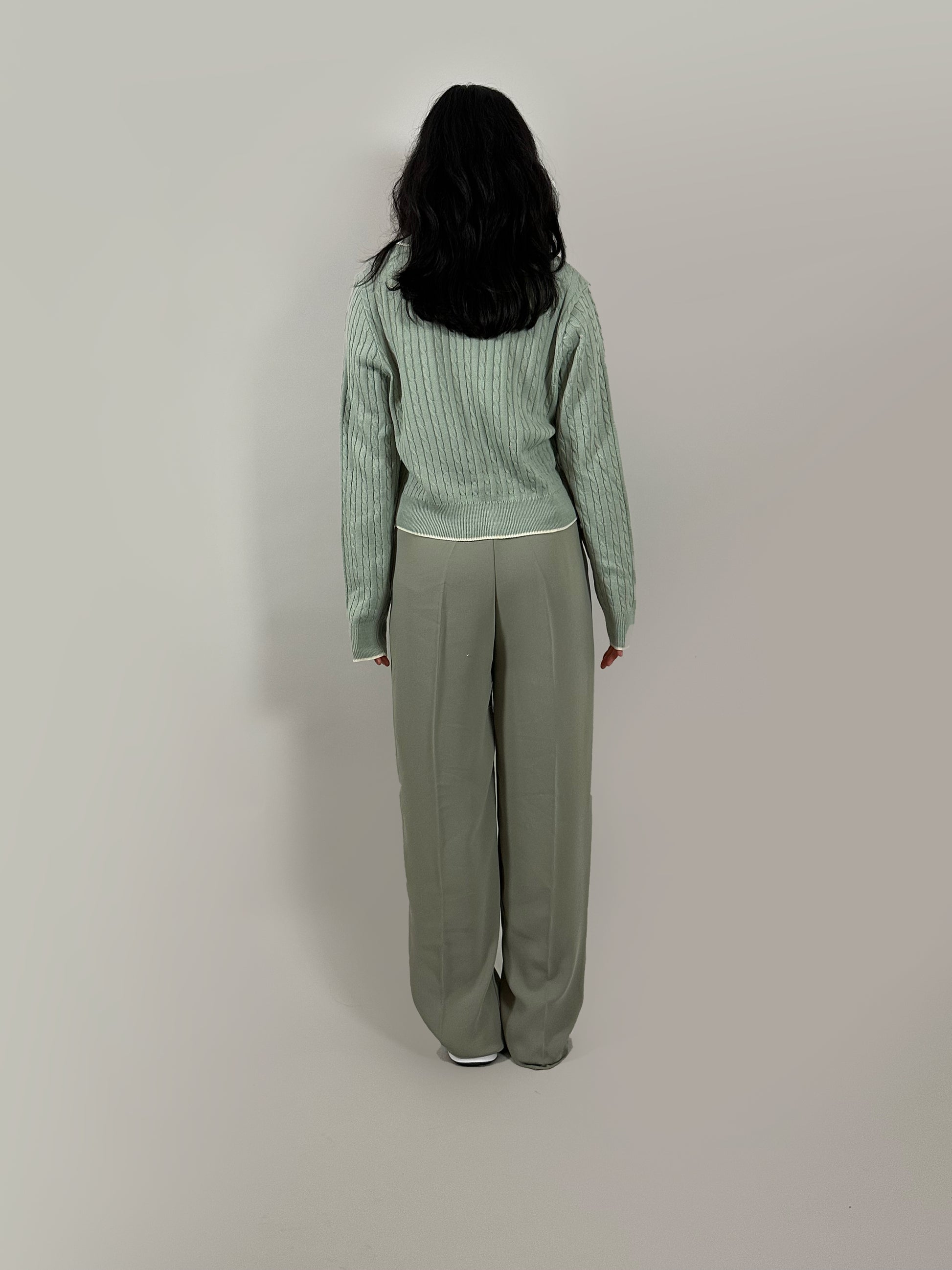 En ribbstickad tröja med v-neck i färgen turkosgrön. Tröjan har krage och svarta knappar. Finns även i färgen off-white.