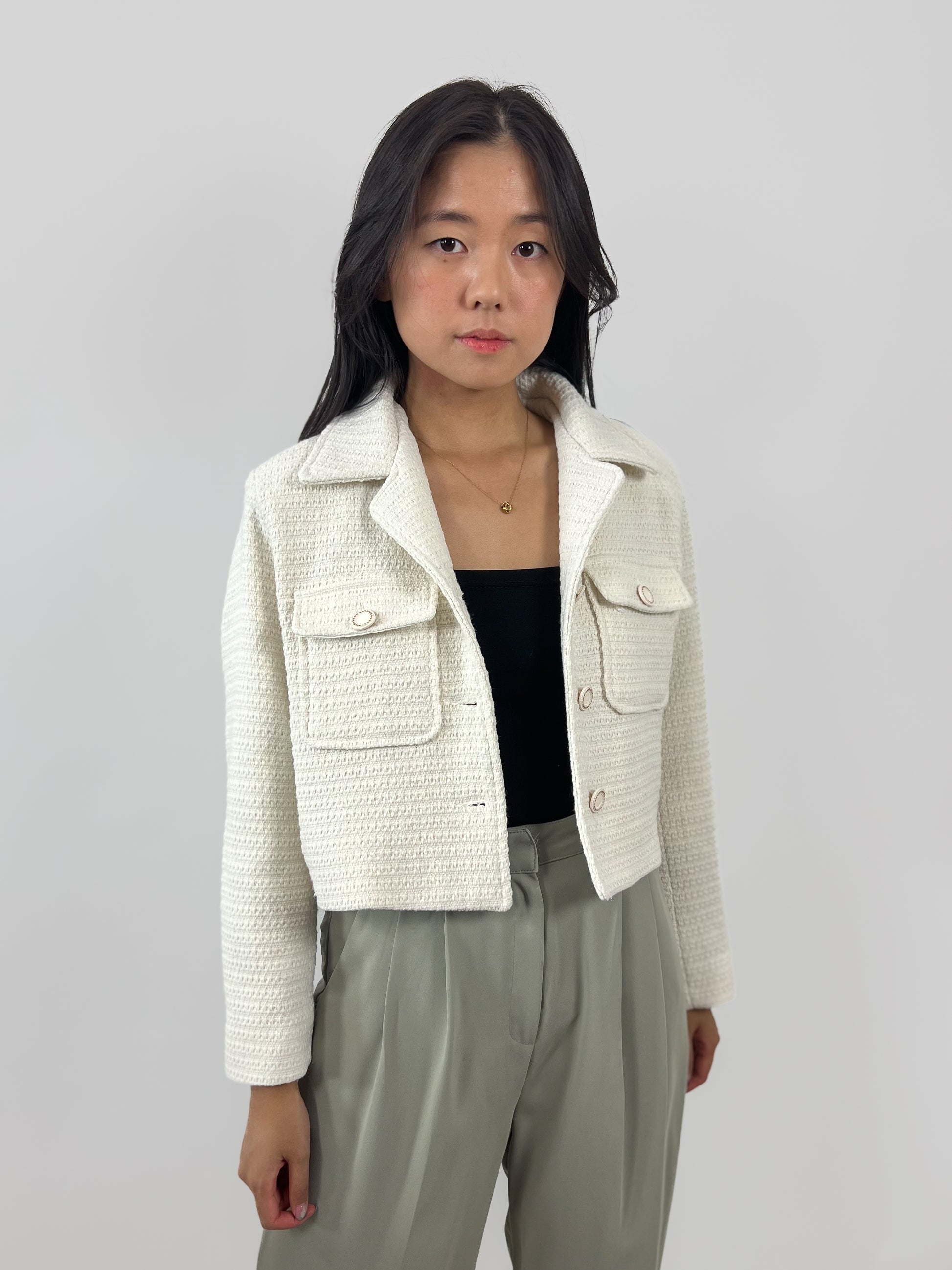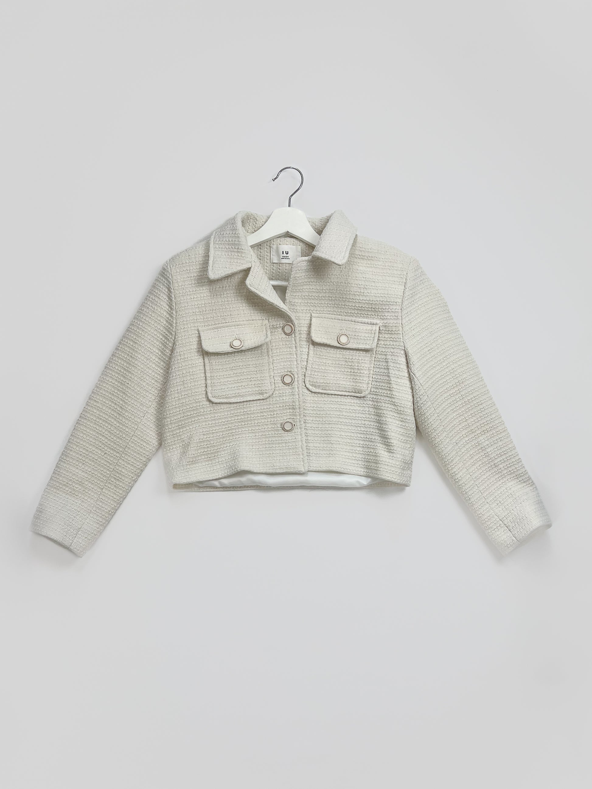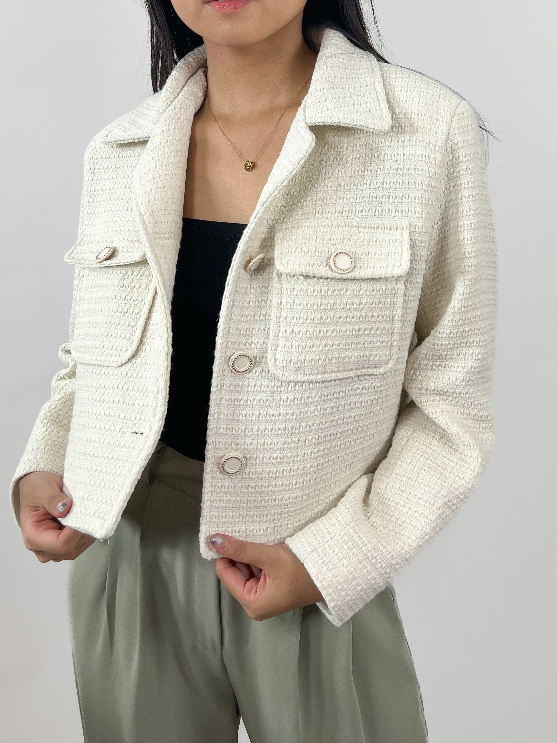 En stilig och kort höstjacka av tweed. Jackan har krage och eleganta knappar.