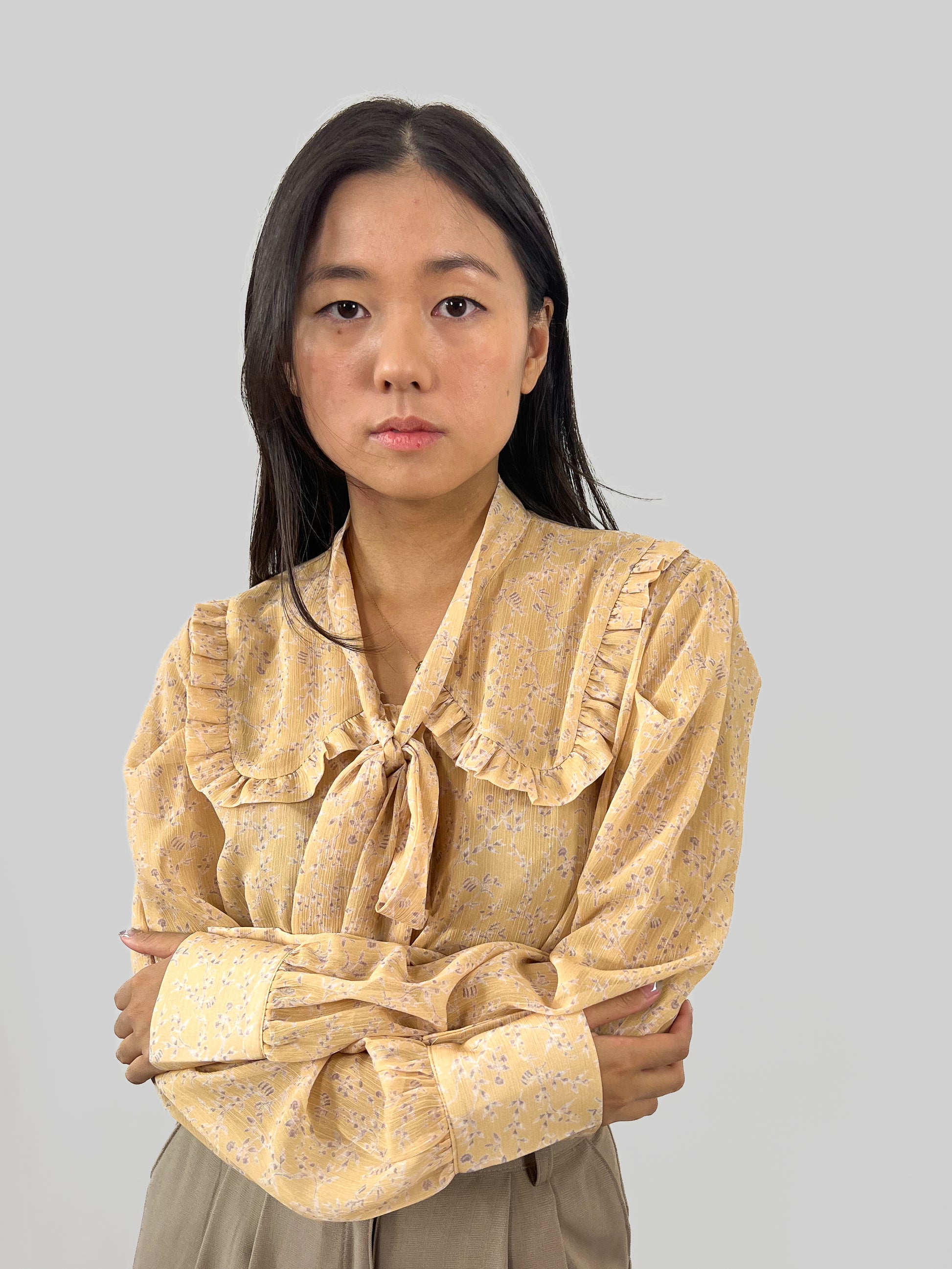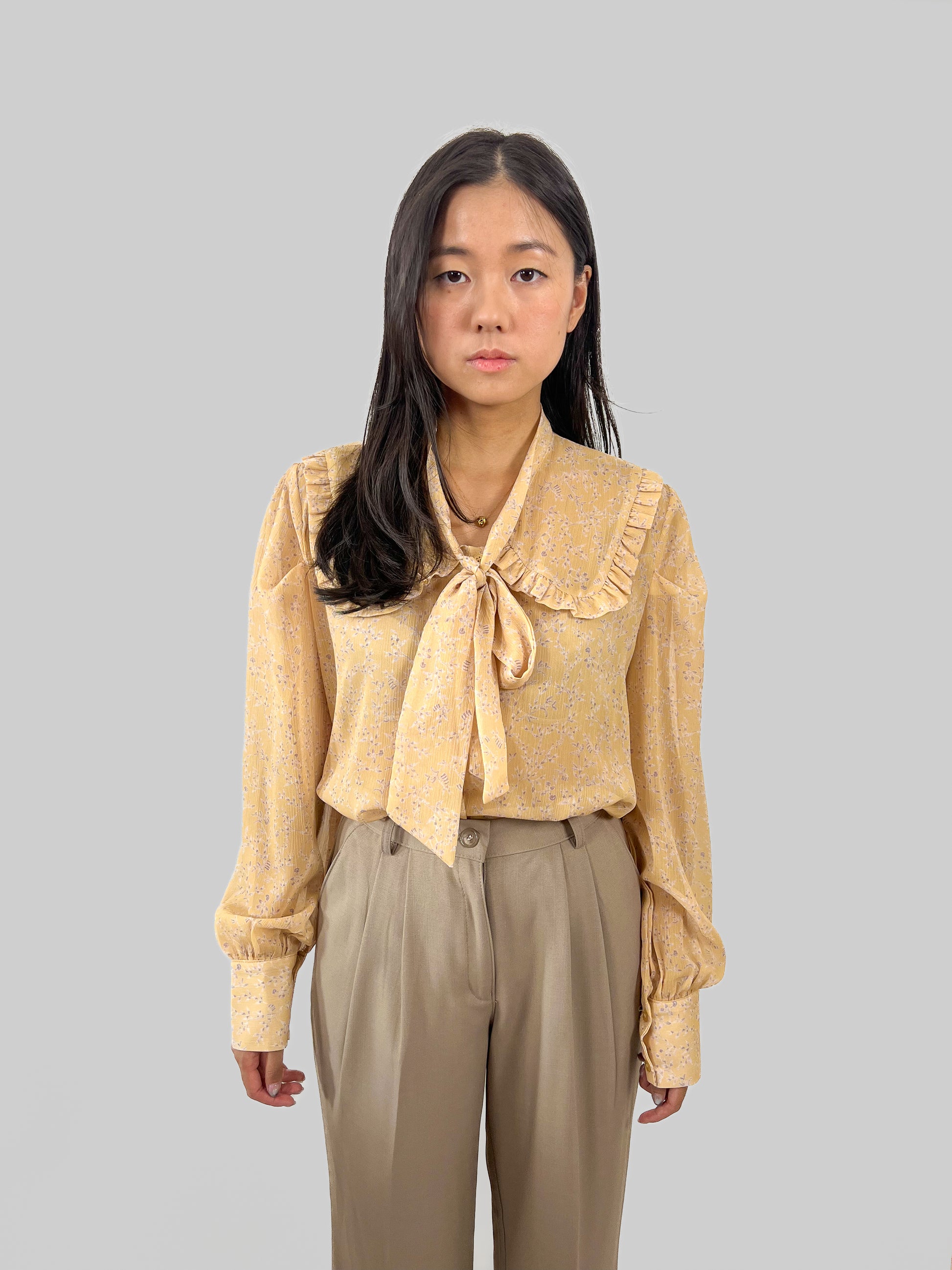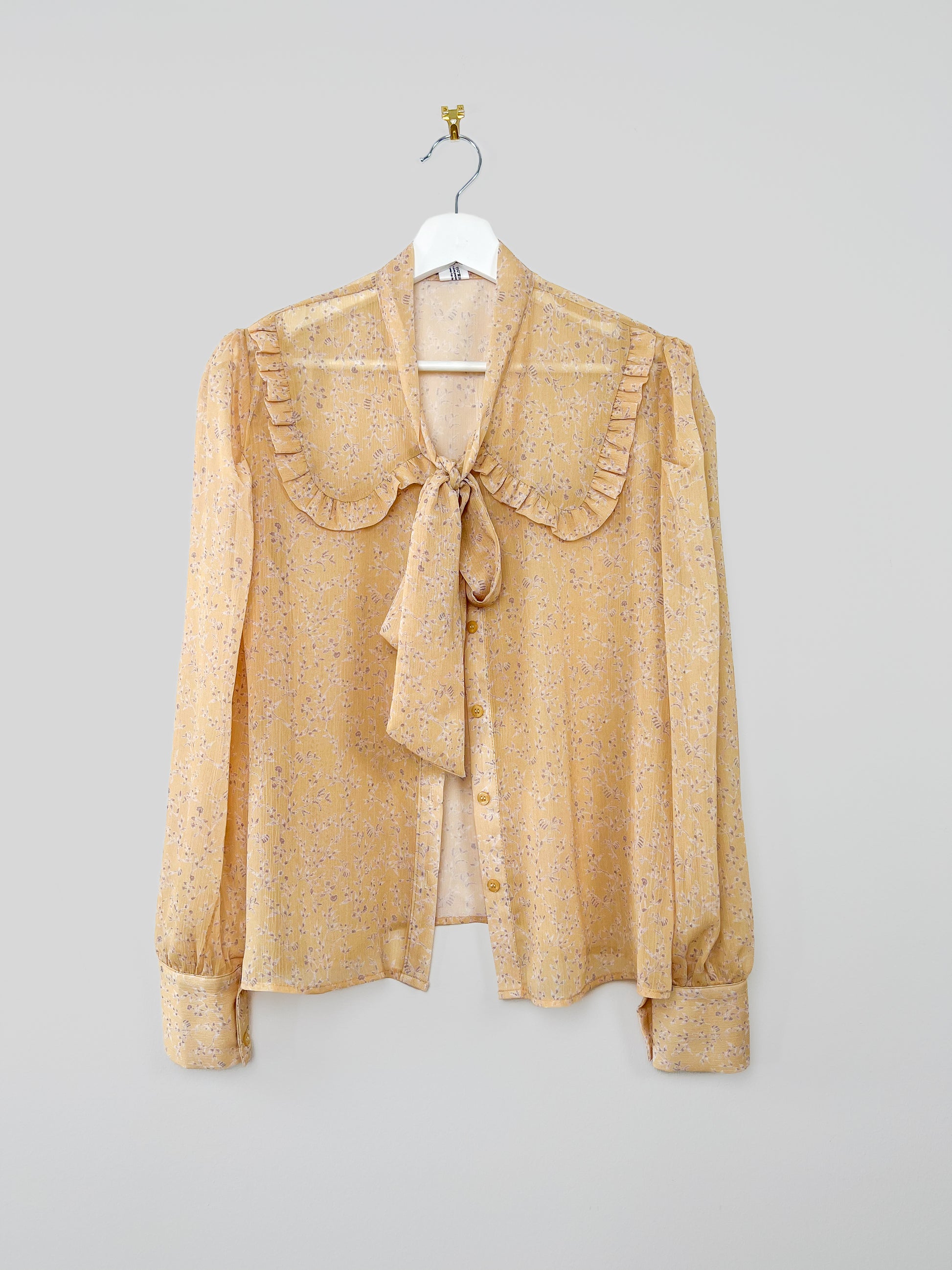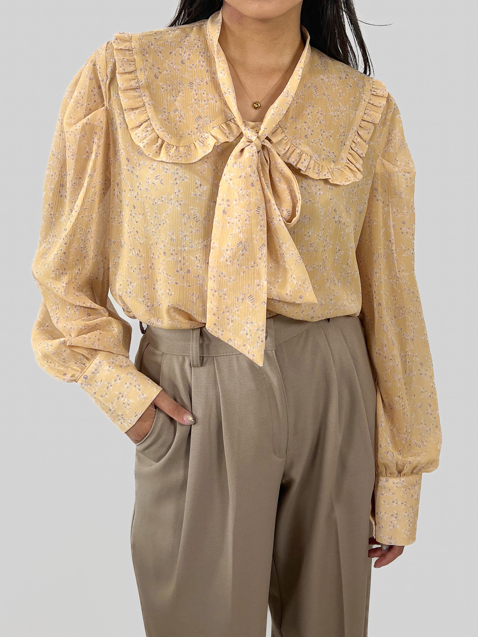 En söt och elegant knytblus på samma gång. Tyget är tunt och lite genomskinligt med blommönster.